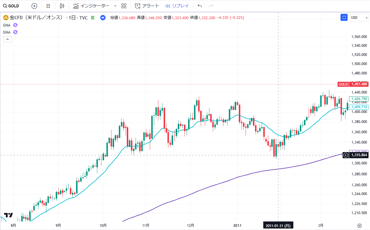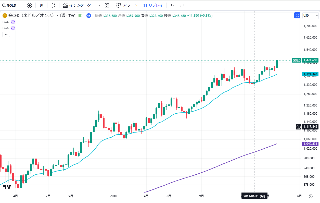 2011年1月足は、上昇トレンド中に前月陽線に対して安値を切り下げるような陰線を形成している、という点で、2024年11月現在のGOLDの値動きと類似している。