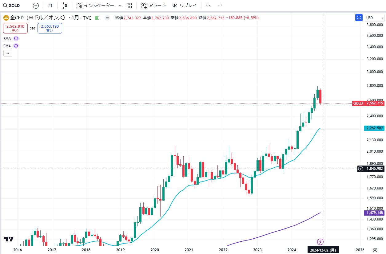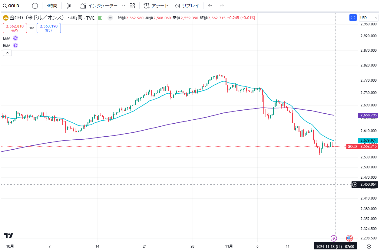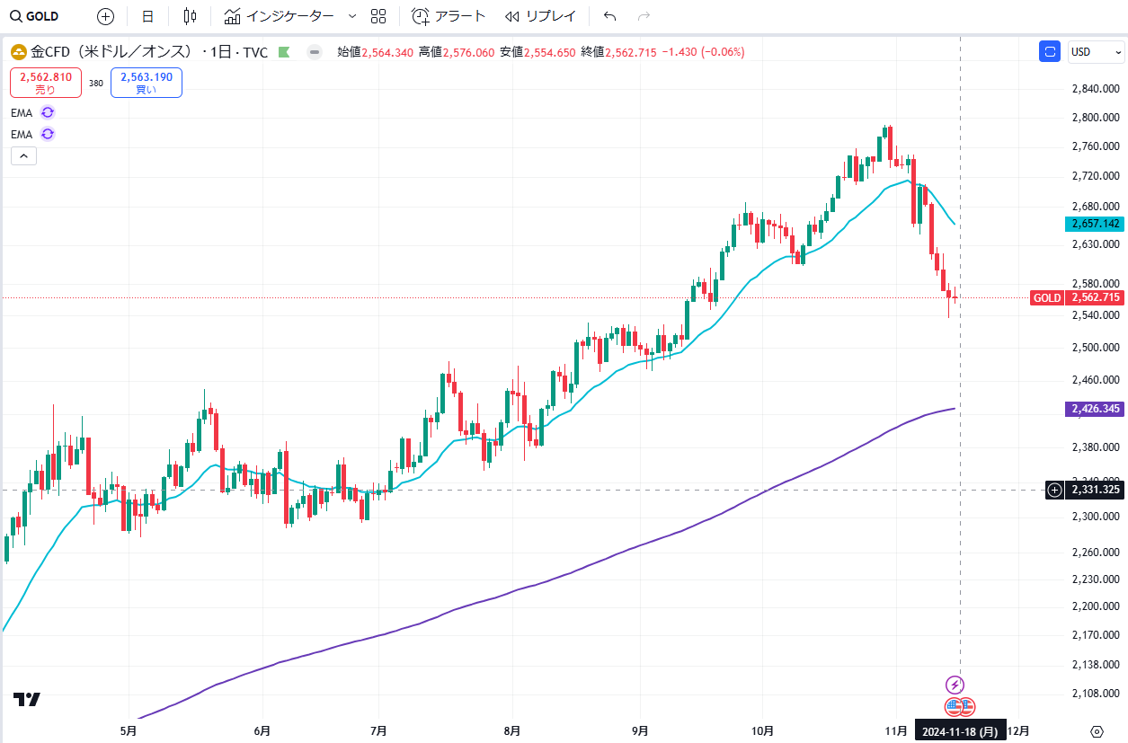 明らかな上昇トレンドの最中に下落し、週足が20EMAに実体を接地するように落ちてきた形で2024年11月11日週のGOLDは確定しました。