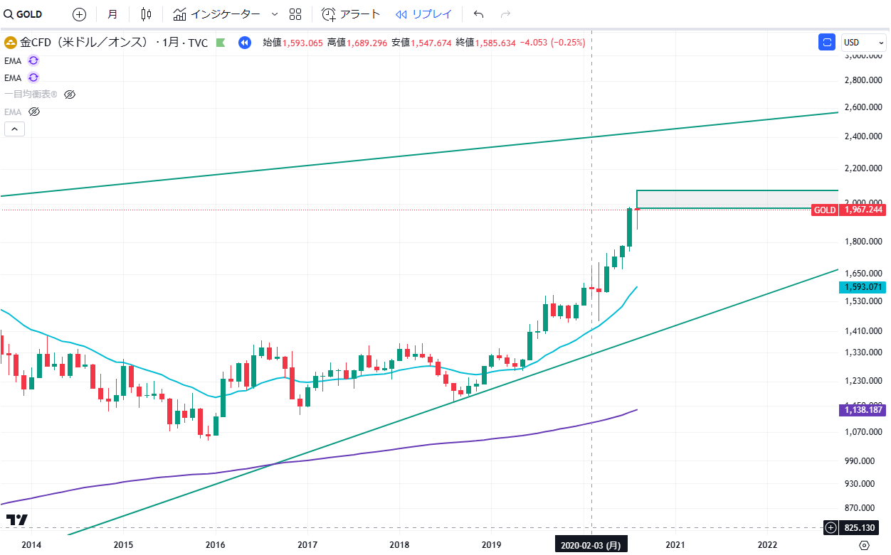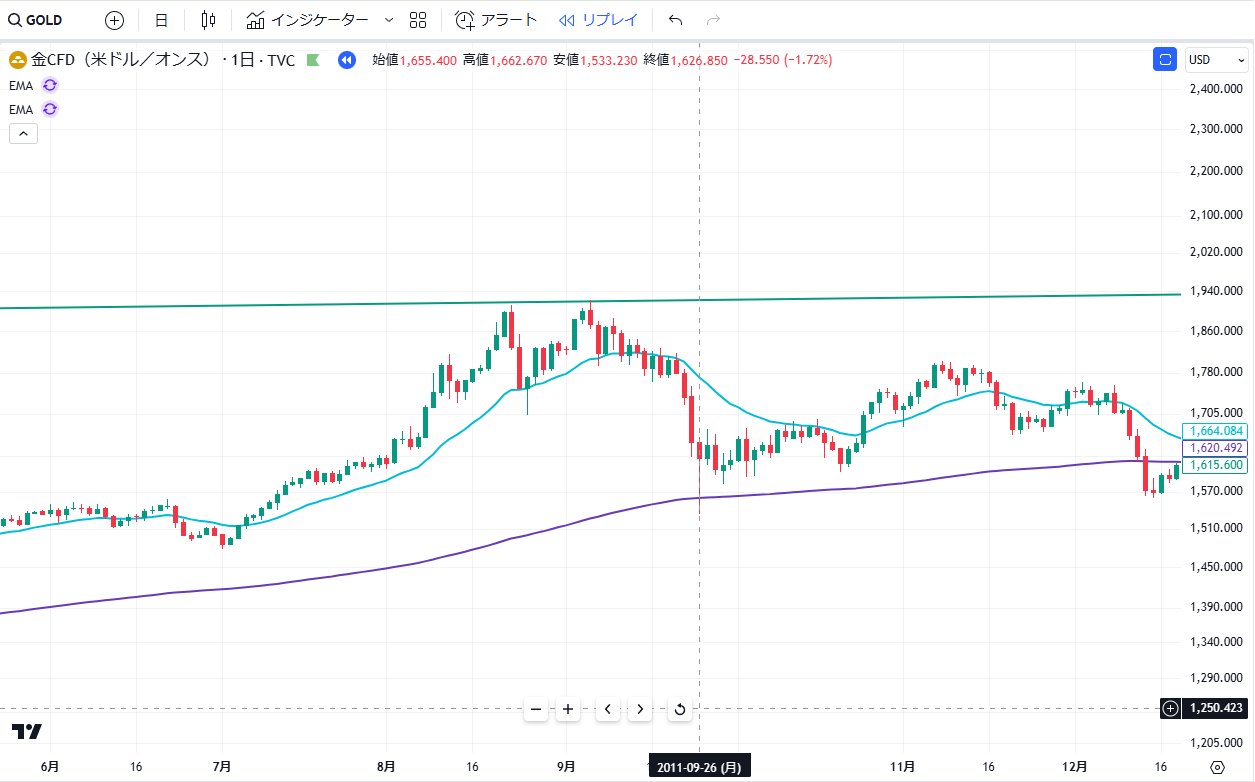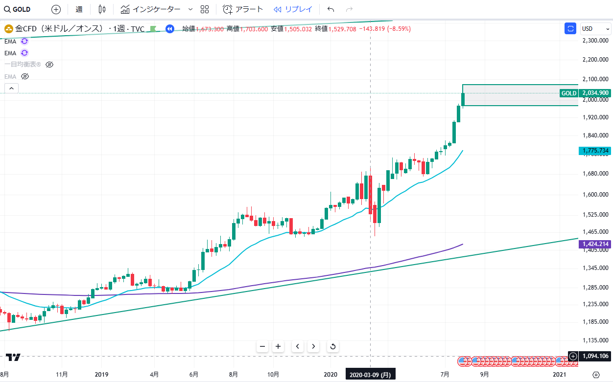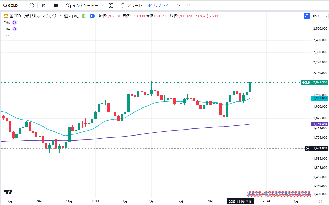 明らかな上昇トレンドの最中に下落し、週足が20EMAに実体を接地するように落ちてきた形で2024年11月11日週のGOLDは確定しました。