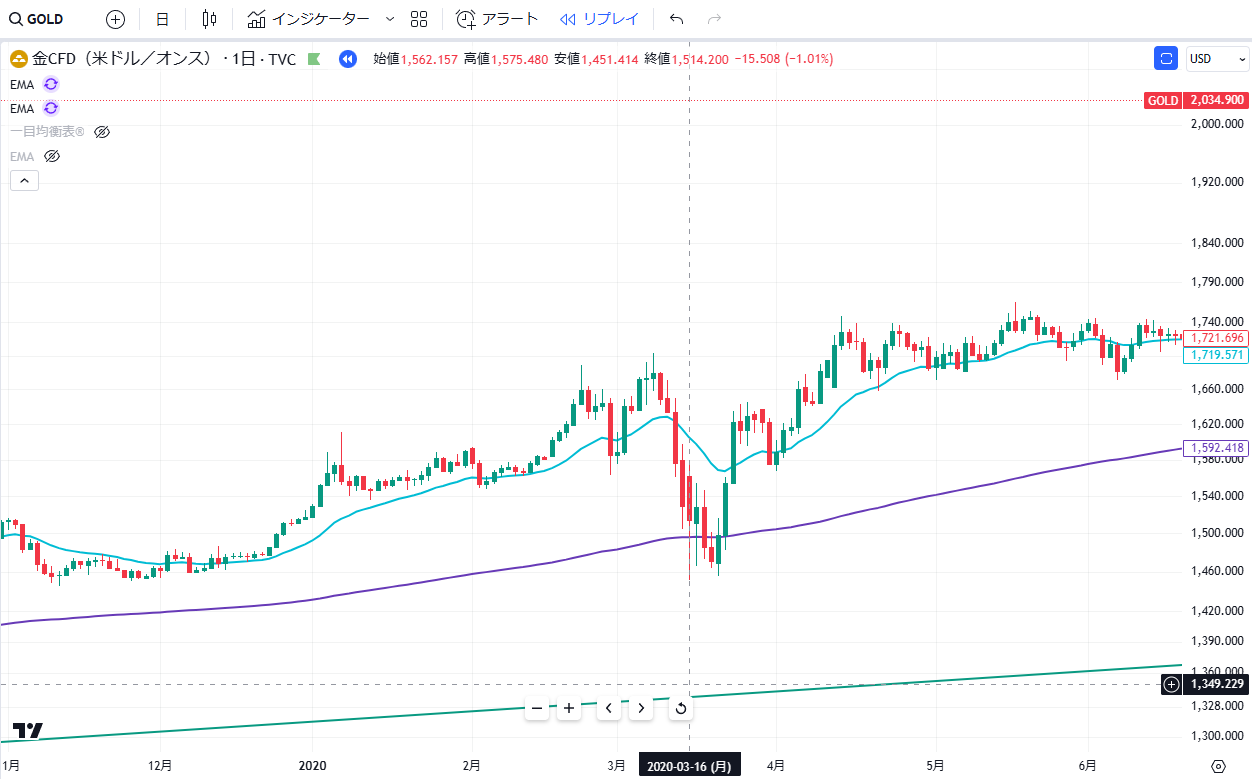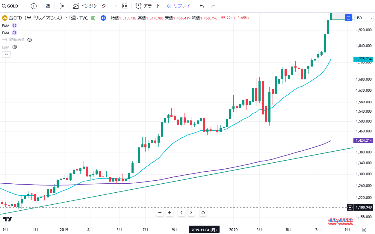 2020年3月9週は少し実体は下抜けているが、上昇トレンド中に週足が20EMAまで下落してきたパターン。