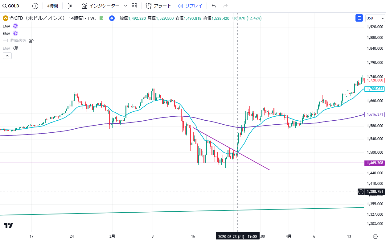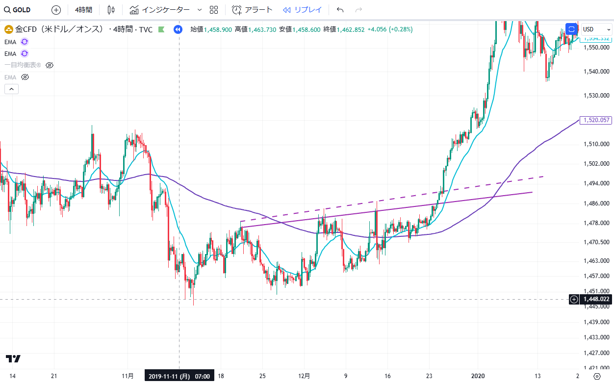 4時間足の200EMAがサポートとなって、反発上昇に至っている。