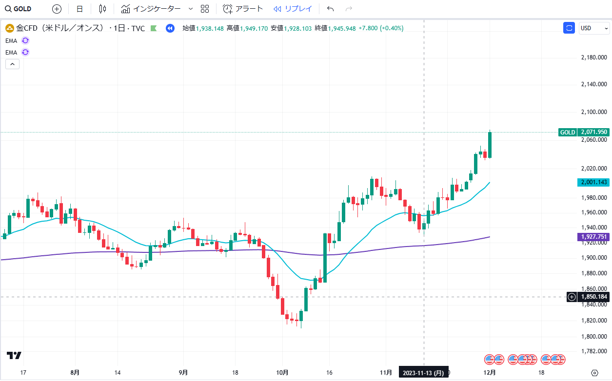 2023年11月6週の週足は上昇トレンド中に週足が落ちてきて、実体が20EMAに接地した形で類似している。