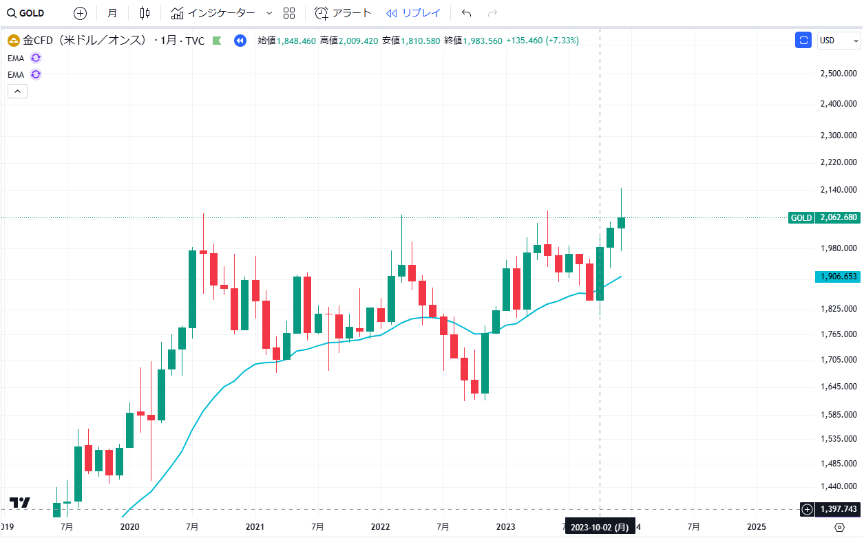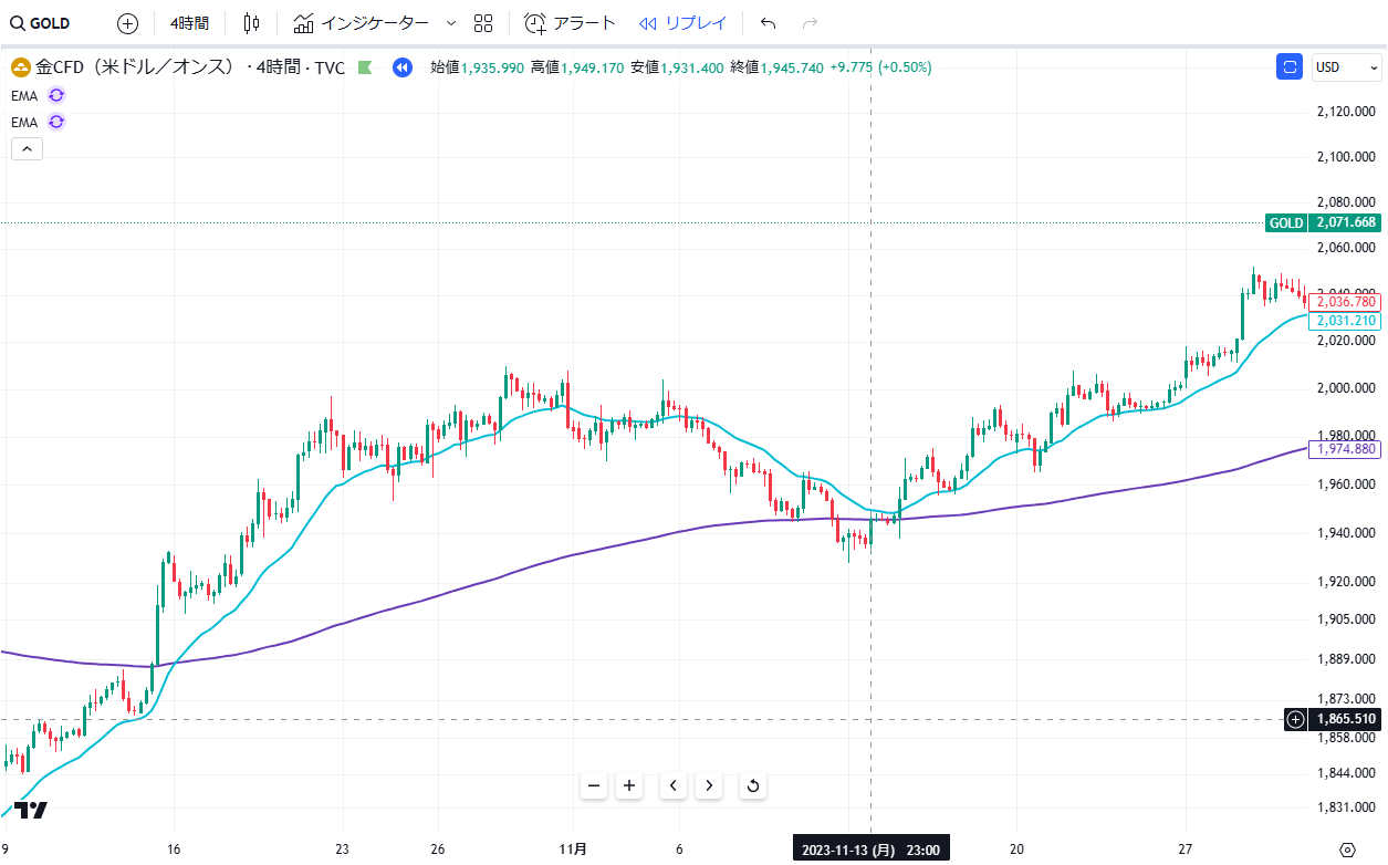 前月にあたる2023年10月の月足は、更に前月の陰線に対して実体を切り上げる陽線を形成しており、上昇が強いことが上位足で明確化しているため、週足レベルで下落しても、翌週以降すぐに買い戻しの動きが入ったと推測される。