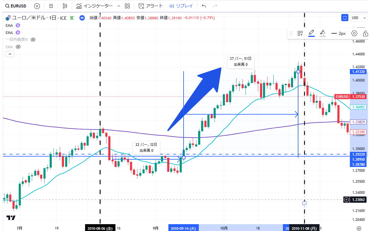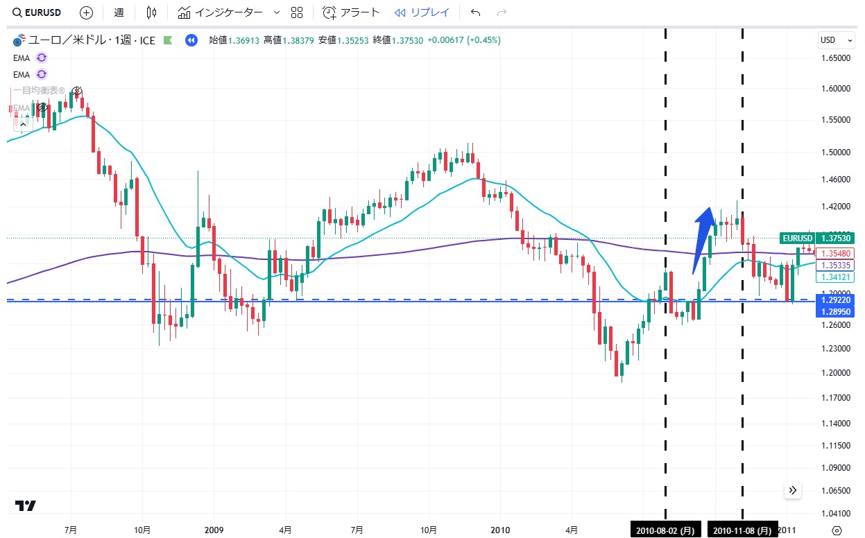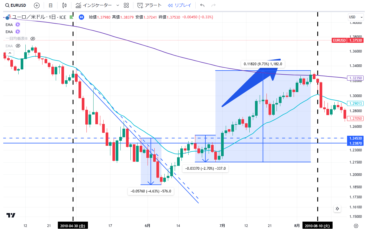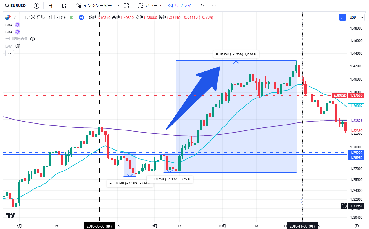当記事は、通貨EURUSDペアの2010年の上昇・下落の値動きについて、