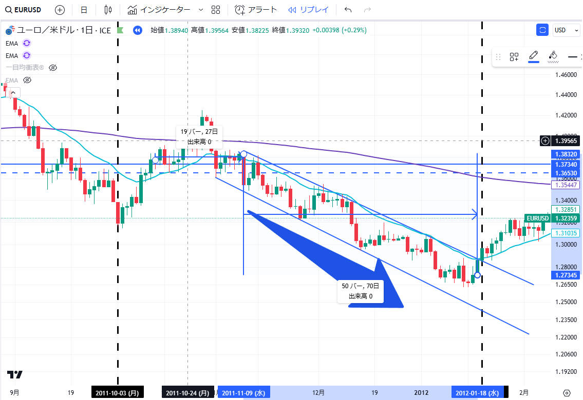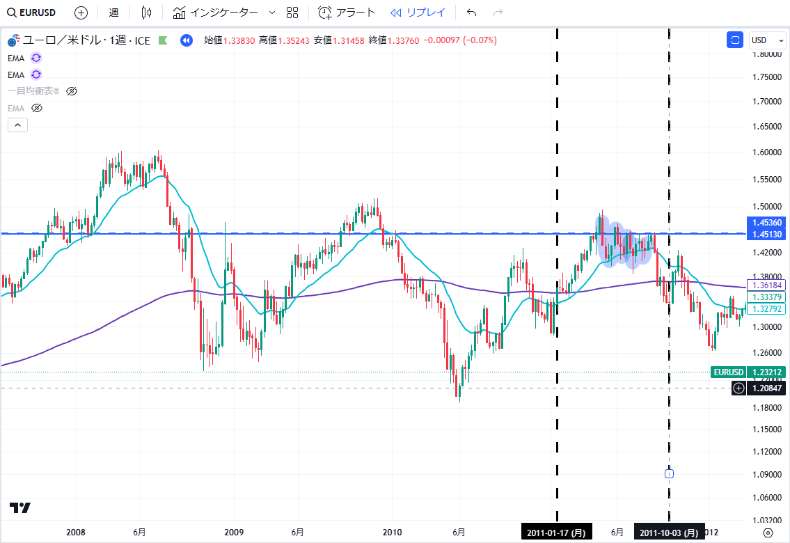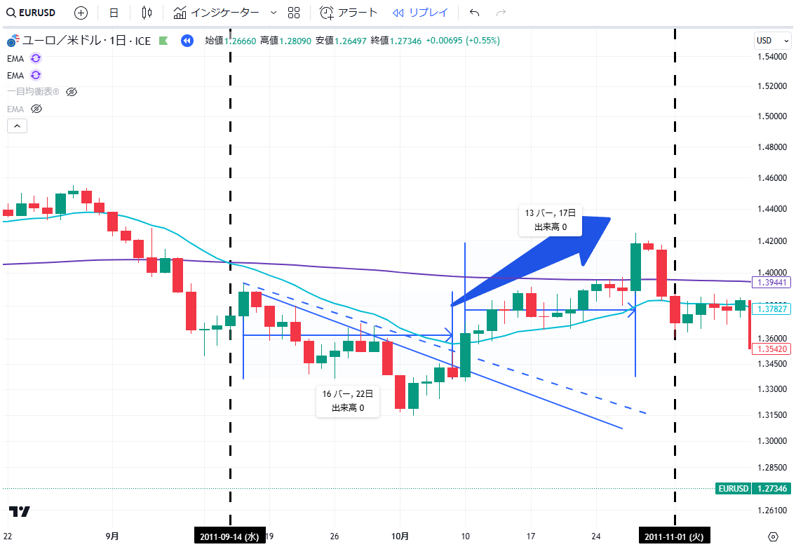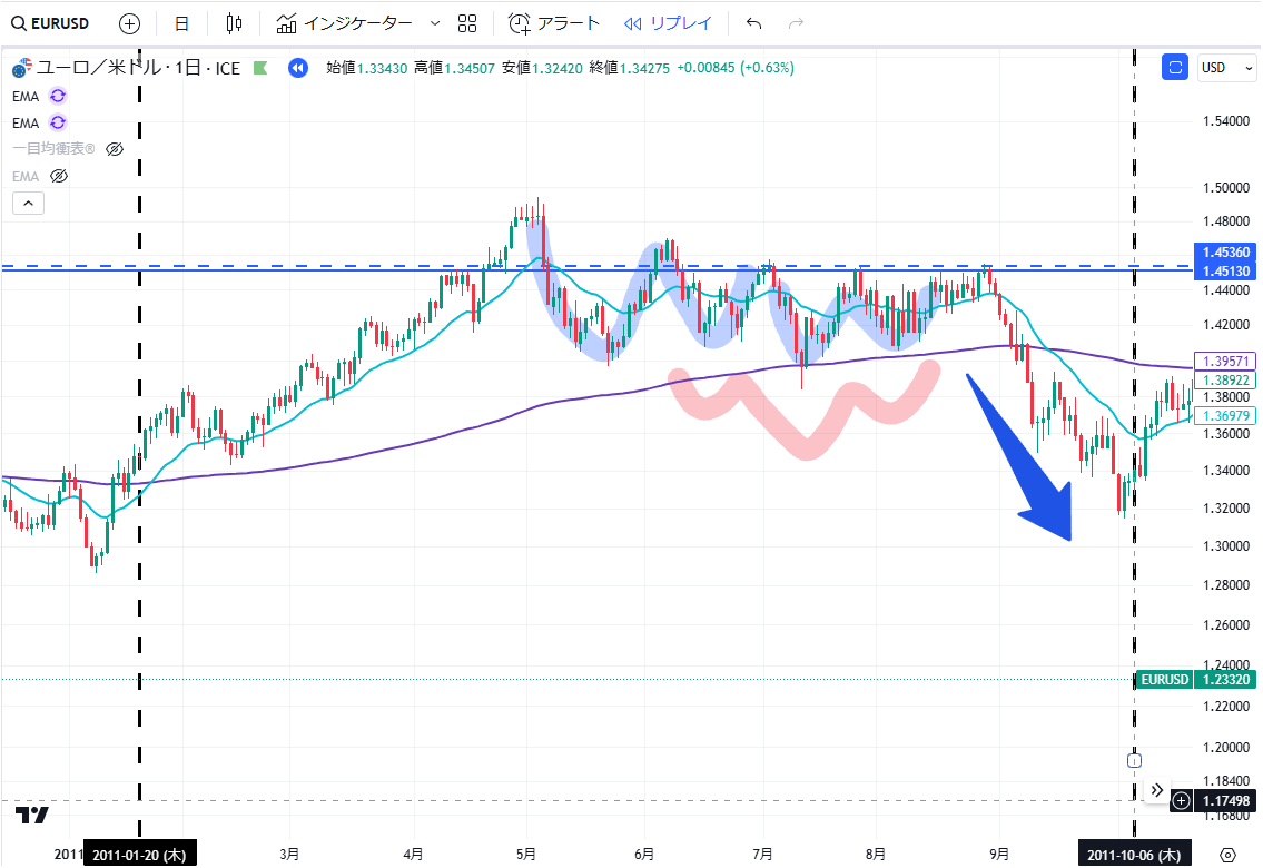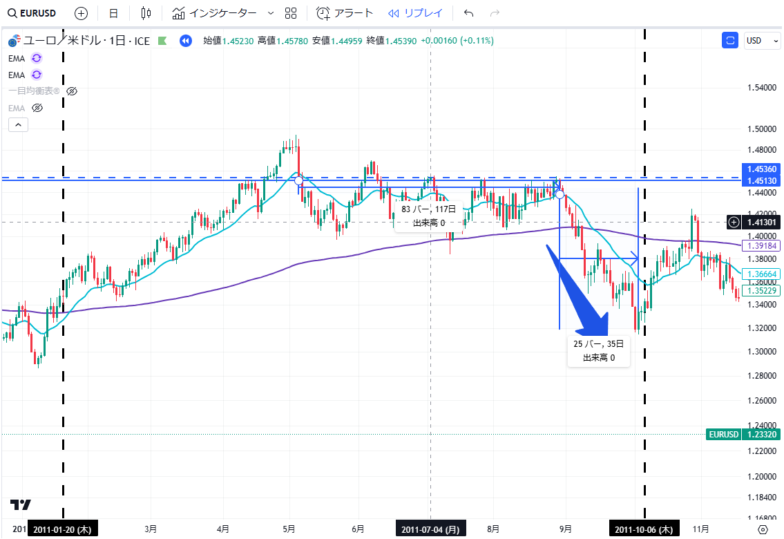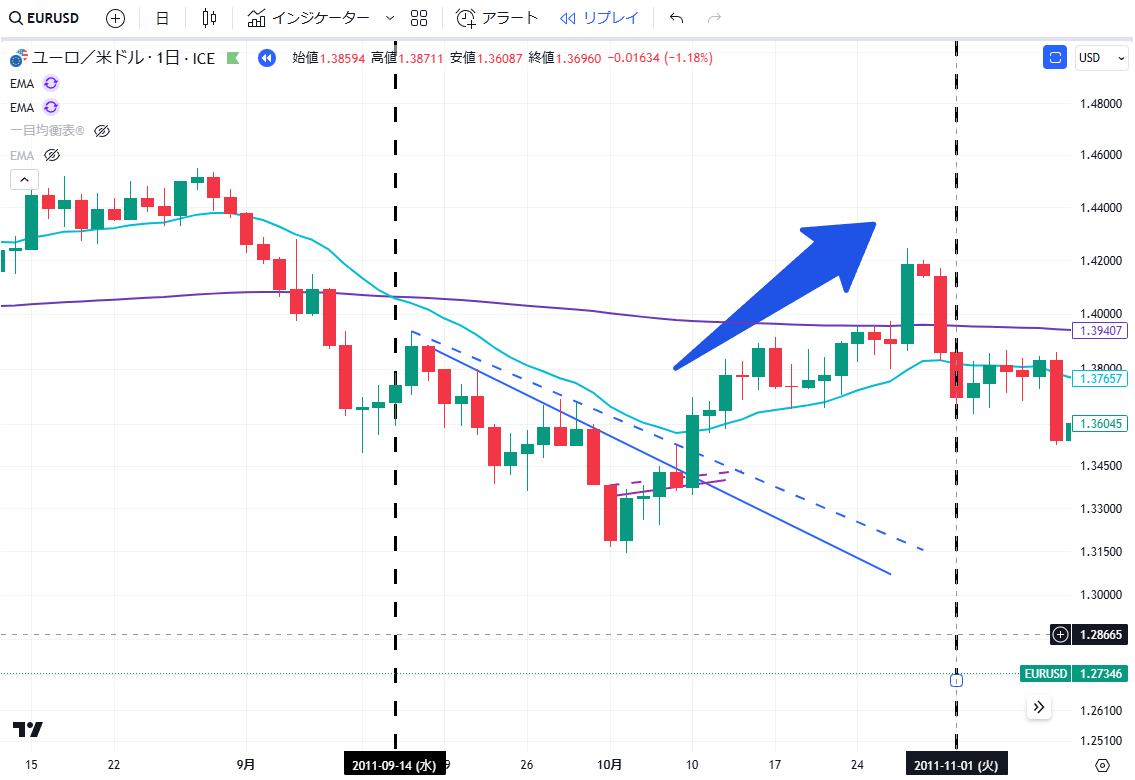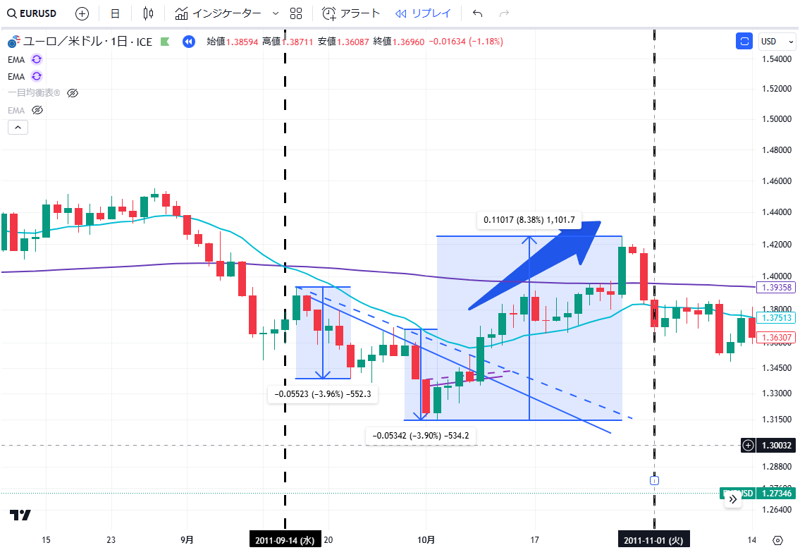 当記事は、通貨EURUSDペアの2011年の上昇・下落の値動きについて、