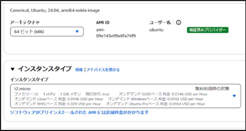 - インスタンスタイプ:t2.micro(無料利用枠あり)