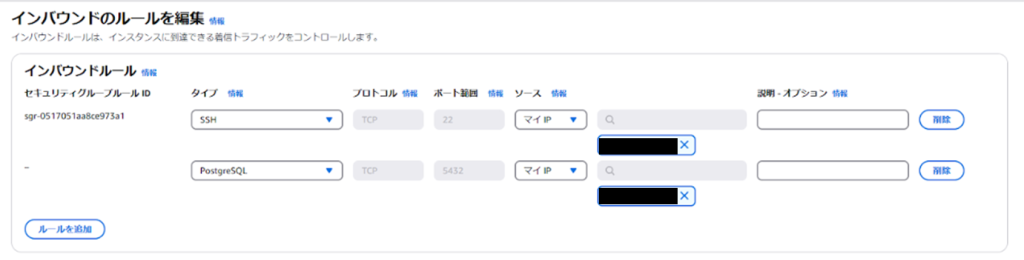 この設定のままだと、EC2 内部でしか PostgreSQL にアクセスできないため、外部(自分のPC)から接続できません。