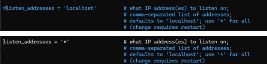 外部からの接続を許可するには、listen_addresses の値を次のように修正します: